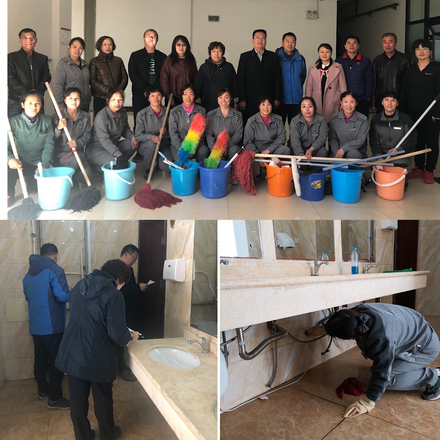中午12:30比赛正式开始,通过现场抽签,确定每组负责的2个卫生间,比赛规定参赛选手在30分钟内对卫生间地面、墙面、便池、隔板、玻璃、窗台、墩布池、暖气,垃圾等进行快速清理。比赛中,参赛选手身手矫健,挥汗如雨,争分夺秒,团结协作,现场气氛十分热烈。