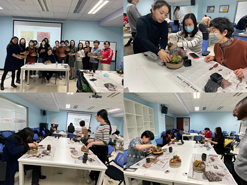 活动邀请到的专业园艺师首先就多肉的种类、种植、养护经验,以及浇水、日照、病虫害防治等知识做了详细的讲解。然后为大家手把手指导多肉的种植。老师们都变身为巧手花匠,兴致盎然地培土、栽种、铺石、装饰……,并按照种类、颜色、层次搭配组合,一盆盆造型别致、绿意盎然的多肉植物呈现在大家眼前。完成种植后,大家一起拿着精致的作品拍照,相互点评,乐在其中。