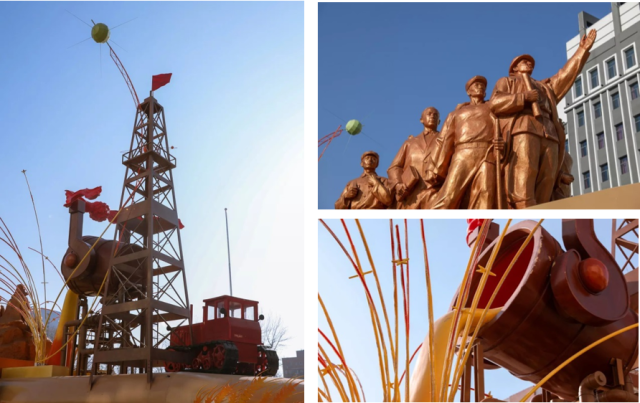“艰苦奋斗”彩车展示中华儿女满腔豪情,在新中国一穷二白的基础上,自力更生、艰苦创业,我国社会发生了翻天覆地的变化,为中国发展富强、人民生活富裕奠定了坚实基础。彩车车头以王进喜、时传祥等劳模群雕为主体形象,车体由新中国第一艘万吨轮、第一辆解放卡车、第一辆东方红拖拉机和油田井架、“两弹一星”、丰收稻谷等构成,彰显建设社会主义时期的火热的建设场景和时代精神。