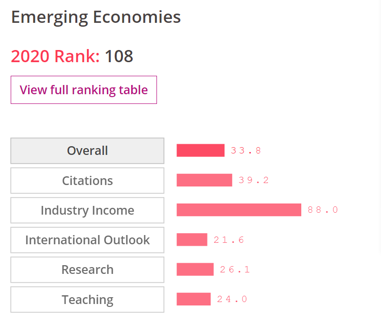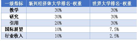 与世界大学排名一样,新兴经济体大学排名也使用13个精心校准过的绩效指标提供最全面和平衡的考量,但其权重经过专门调整以反映新兴经济体大学的特征,较之世界大学排名,国际展望与行业收入指标更加受到重视。