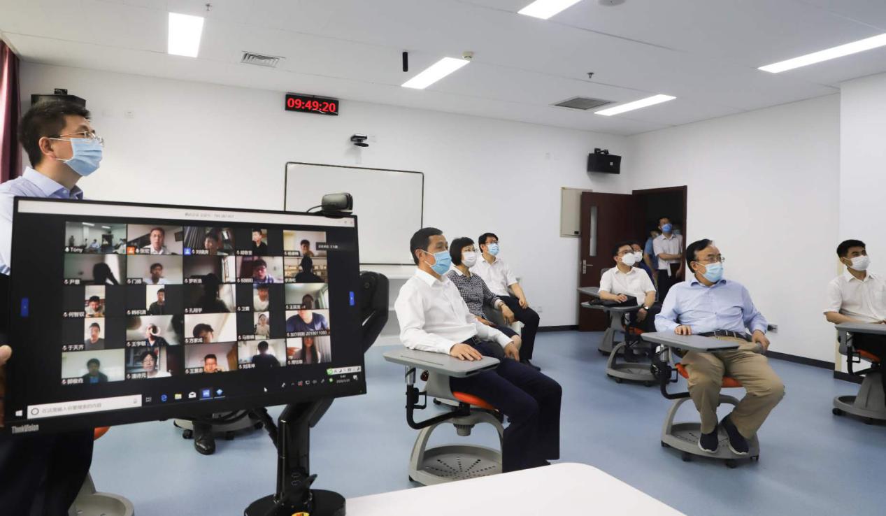 钟登华副部长一行首先实地查看校园安防情况。在中控室,他详细了解了校园安防特别是疫情期间校园防控情况。随后,在第四教学楼智慧教室,钟登华副部长现场观摩了张宏教授《管道与储罐强度》线上授课情况,并与老师和同学进行了在线交流,向大家表达亲切问候,充分肯定了教师线上授课工作和同学们线上学习热情以及学校线上教学取得的成效。