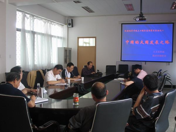 为纪念改革开放30周年,人文社科部政治与公共管理教研室开始举办纪念改革开放30年系列学术研讨活动,研讨活动之一“中国的大国发展之路”学术交流会于近日举行。会议由庞昌伟教授主持,社科部主任胡新华、副主任李卫红出席。徐斌、韩英军两位副教授分别结合近期在中央党校研修班的学习经历做了主题发言,政治与公共管理教研室全体教师参加了讨论。