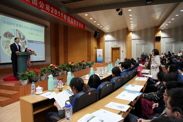 11月2日,中国中化集团2011届毕业生校园招聘宣讲会在石大翠宫报告厅举行。中化集团公司人力资源部副总经理崔炎、中化集团人力资源部经理华怀峰、中化集团石油中心人力资源部总经理王健等一行7人出席了招聘会。