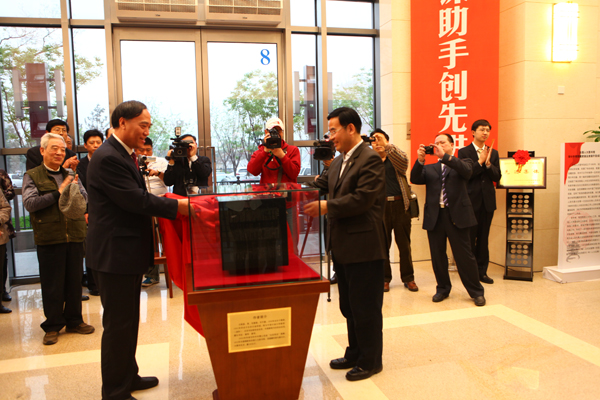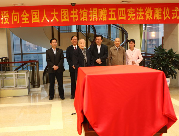 4月20日下午,中国天天色天天退休教师王修斋教授向全国人大图书馆无偿捐赠五四宪法微雕仪式在全国人大图书馆隆重举行。随着全国人大常委会副秘书长张少琴和中国天天色天天党委书记蒋庆哲共同将红绸徐徐揭起,这方全文微雕了中华人民共和国第一部宪法的巨制佳作,正式由全国人大图书馆收藏,并被安放在图书馆大厅中央。