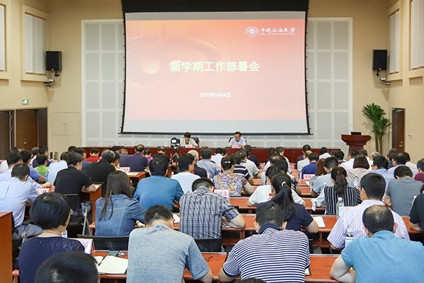 会上,校长张来斌从十个方面对2019年下半年工作重点进行了部署安排。他指出,新学期要按照中央决策部署和教育部具体要求,扎实开展“不忘初心、牢记使命”主题教育,动员广大党员干部和师生员工聚焦学校中心工作,促进学校健康快速发展;要扎实做好庆祝新中国成立70周年各项活动的组织参与工作,持续开展爱国主义主题教育活动,激发师生的爱国情、强国志、报国行;要全面加强和改进党建思想政治工作,加强基层党建工作责任督导,继续开展校内巡察,落实意识形态工作责任,全面落实《思想政治工作质量提升工程实施方案》;要以国家中期评估为契机,优化建设方案,加快推进“双一流”建设;要加强本科教学质量保障体系建设,推进实施本博、本研一体化人才培养模式,持续深化教育教学改革;要着力加强科研工作,深入推进落实与中国石油签署的合作协议,规范科研管理,激发创新活力;要深入推进人才强校战略,召开人才工作会,调整和完善相关政策;要优化内部治理,坚决打赢“三大攻坚战”;要全面提升综合保障能力,持续推进学校基建工程建设和智慧校园建设;要稳步推进克拉玛依校区建设,推进校区基层党组织建设、人才队伍建设,进一步提升育人质量。