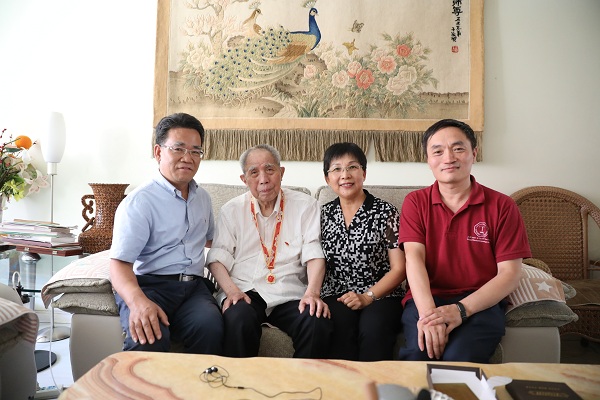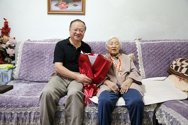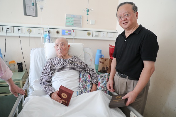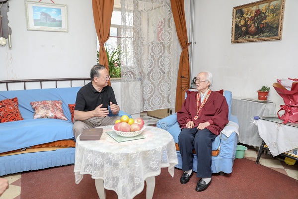 山红红来到中国工程院院士沈忠厚教授家中,亲自为他佩戴上纪念章,向沈院士60多年来牢记使命、淡泊名利,教书育人、科研报国的崇高精神品格表达敬意,祝福他节日快乐,健康幸福。