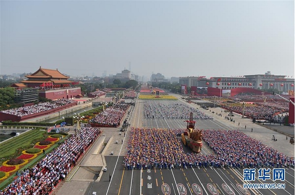 10月1日,庆祝中华人民共和国成立70周年大会在北京天安门广场隆重举行。中共中央总书记、国家主席、中央军委主席习近平发表了重要讲话。庆祝大会后,举行了盛大的阅兵和群众游行。中国天天色天天(北京)党委书记山红红、校长张来斌等10余位师生代表应邀现场观礼,1000余名师生参加了“艰苦奋斗”群众游行方队。