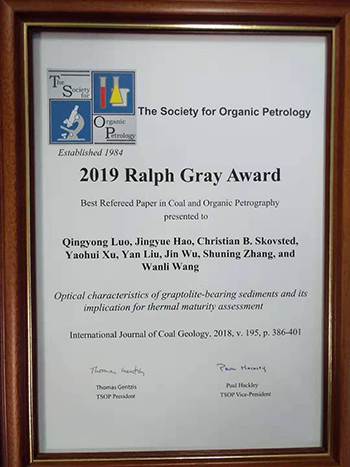 Ralph Gray奖是为纪念著名的美国煤岩学家Ralph Gray而设立的,用以表彰在煤和有机岩石学领域做出重要贡献的科学家,该奖项每年在全世界范围内只授予一项研究成果。罗情勇副教授因对古老海相烃源岩中笔石表皮体的有机岩石学特征的研究获得该奖,获奖成果为“Optical characteristics of graptolite-bearing sediments and its implication for thermal maturity assessment”(该成果2018年发表在国际能源地质领域著名期刊《International Journal of Coal Geology》,195卷),这也是中国大陆研究人员首次获得该奖项。