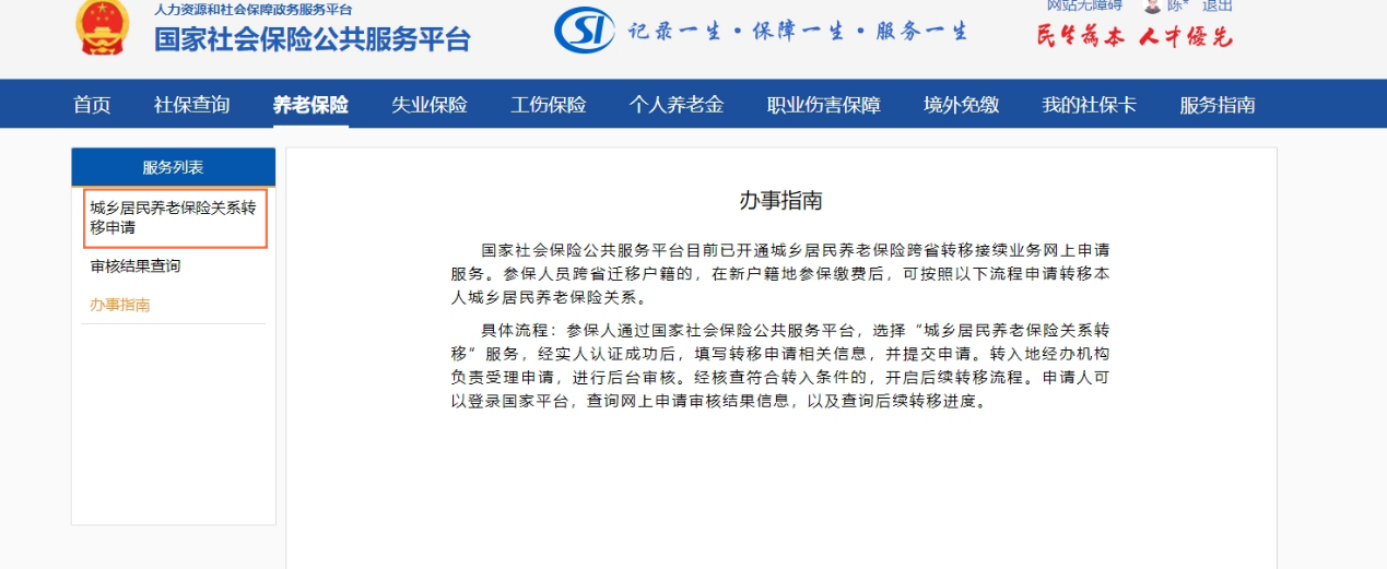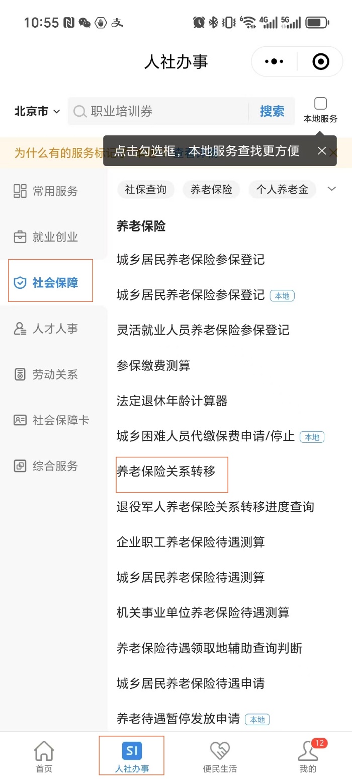 2. 在“人社办事”模块下,找到“社会保障”,选择“养老保险”下的“养老保险关系转移”。