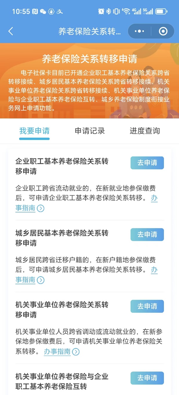 3. 进入后选择申请(以城乡居民养老保险关系转入为例)