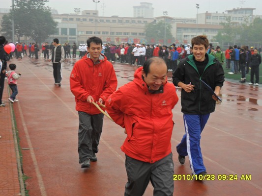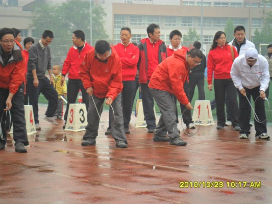我校教职工趣味运动会于2010年10月23日上午举行。在本次运动会中,我院教职工积极踊跃地参加了整个运动会,大家团结合作,奋力拼搏,取得了可喜的成绩。在集体项目中,我院老师取得螃蟹赛跑和脚夹球两项的三等奖;在个人项目中,甄小东老师和高艳老师分别取得沙包掷准项目的第三名、第四名。在比赛中,我院教职工充分展现了的同心协力、奋勇拼搏的精神风貌,在党政工团4*50米接力赛项目中,我院领导亲自带队,为我院全体老师做出了榜样;在彩虹飞舞项目中,我院16名女老师团结互助,跌倒爬起来继续比赛;在脚夹球项目中,我院男老师相互合作,稳中求胜,取得了本项目的三等奖;在时代列车项目中,我院男、女老师互相配合、团结协作,充分展现了我院的凝聚力和团结性。