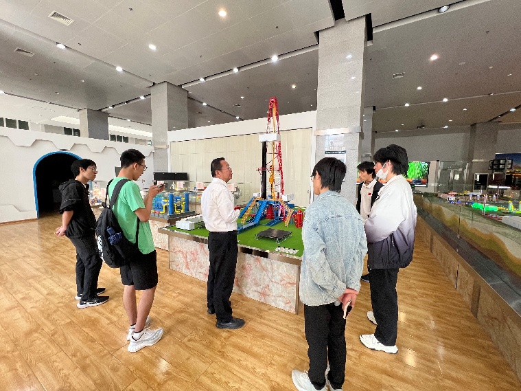 在深海工程创新团队实验室负责人朱益老师的带领下,学生们依次参观了实验室核心展区:导管架平台系统模拟浅海固定式平台作业工况;自升式平台装置复现浅水钻井作业过程;"海洋石油981"半潜式平台演示深水钻井作业;"深海一号"能源站模拟超深水气田开发关键技术;"海洋石油201"铺管船展示深水海底管道铺设技术;"海洋石油116"FPSO(浮式生产储卸油装置)模拟海上油气处理流程;"海洋石油708"物探船呈现海洋地质勘探前沿技术。这些展区系统展示了我国自主研制的从浅海到深海、从勘探到生产的全产业链海洋工程装备体系,让同学们对我国海洋工程科技发展成就有了全面认识。