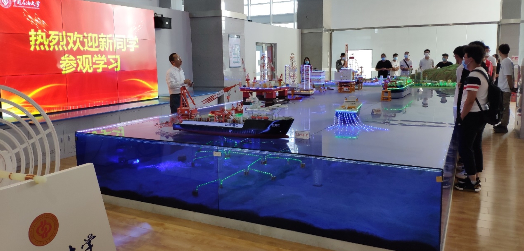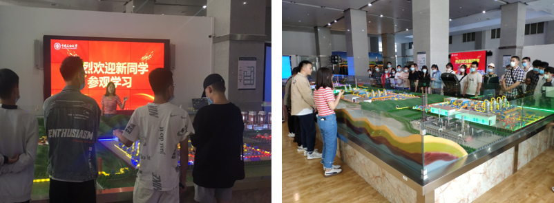 首先,朱益对新生的到来表示热烈欢迎,并对教学演示中心做了整体的介绍。随后详细介绍了海洋平台的类型、功能以及海底管道的铺设,并结合测井系统模型,讲解了测井的基本内容和方法。