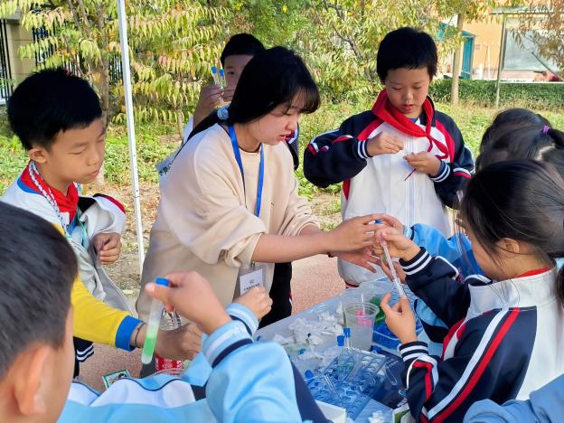 科技梦想,逐梦扬帆起航;科技奥秘,畅享美好未来。为激发孩子们的创造力,10月24日,安全学院26名志愿者抵达沙河第四实验小学进行科技节支教活动,以"科学小实验"为介质,帮助孩子们在探索的过程中体会科学的乐趣。活动期间志愿者们通过气球直升机、酸碱检测、风向标、密度瓶等物理化学小实验激发孩子们的求知欲和探索欲,培养孩子们的探究和学习能力。以理论与实践相结合的方式辅助孩子们完成科学实验和新知识的教学,为孩子们提供全面的教育教学服务。