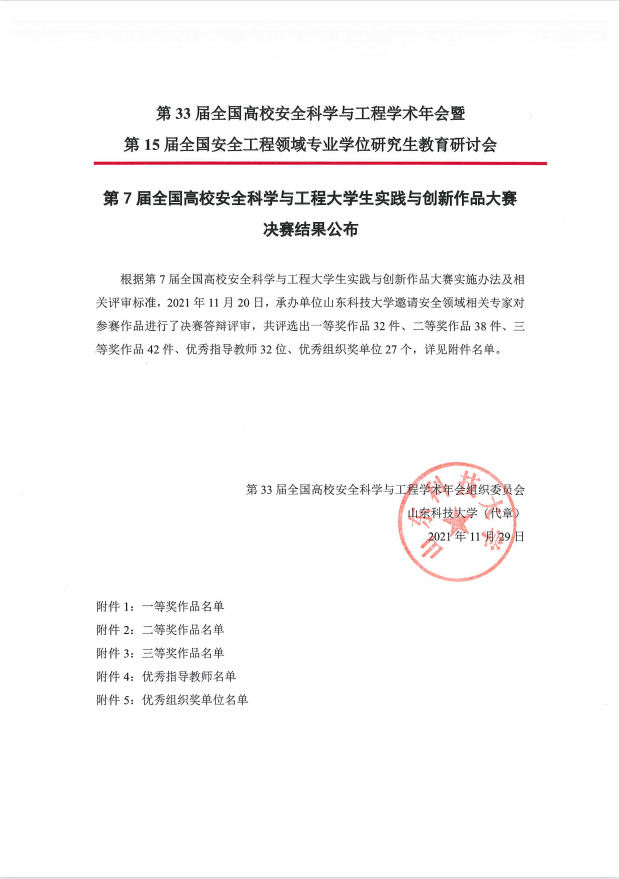 为深入学习贯彻习近平新时代中国特色社会主义思想和党的十九大精神,坚持立德树人根本任务,安全工程专业近年来积极组织开展各类学科竞赛活动,激发了学生的学习兴趣,培养了学生的创新思维,增强了学生的独立工作、团队合作、理论联系实际等各方面能力。以学科竞赛为引领,教师不断提高实践教学能力和竞赛活动组织能力,推动研究性教育教学改革。安全专业将继续以打造知识、能力、素质协调发展的创新型人才为目标,助力学校高水平大学建设。