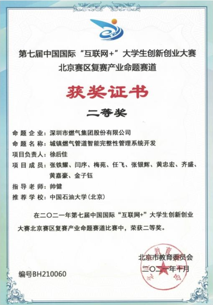 在2021年第七届中国国际“互联网+”大学生创新创业大赛,北京赛区复赛产业命题赛道中,依托深圳市燃气集团股份有限公司,帅健老师指导研究生徐后佳、张铁耀等,以“城镇燃气管道智能完整性管理系统开发”为题,荣获二等奖;郑文培老师指导研究生谢冬、董松等,以“5G+智慧燃气系统应用场景建设”为题,荣获二等奖。该项比赛由教育部与政府、各高校共同主办。大赛旨在深化高等教育综合改革,激发大学生的创造力,培养造就“大众创业、万众创新”的主力军;推动赛事成果转化,促进“互联网+”新业态形成,服务经济提质增效升级;以创新引领创业、创业带动就业,推动高校毕业生更高质量创业就业。