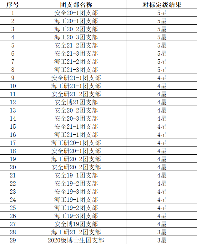 根据《关于开展2022年度团支部“对标定级”工作的通知》,各团支部对照“对标定级”参考标准(2022年版)进行自评,自评定级共分为五星团支部(90分以上)、四星团支部(80-89分)、三星团支部(70-79分)、后进团支部(60-69分)以及软弱涣散团支部(60分以下)五个层级。学院通过三必核、两必听”的方式进行复核认定。最终认定结果如下: