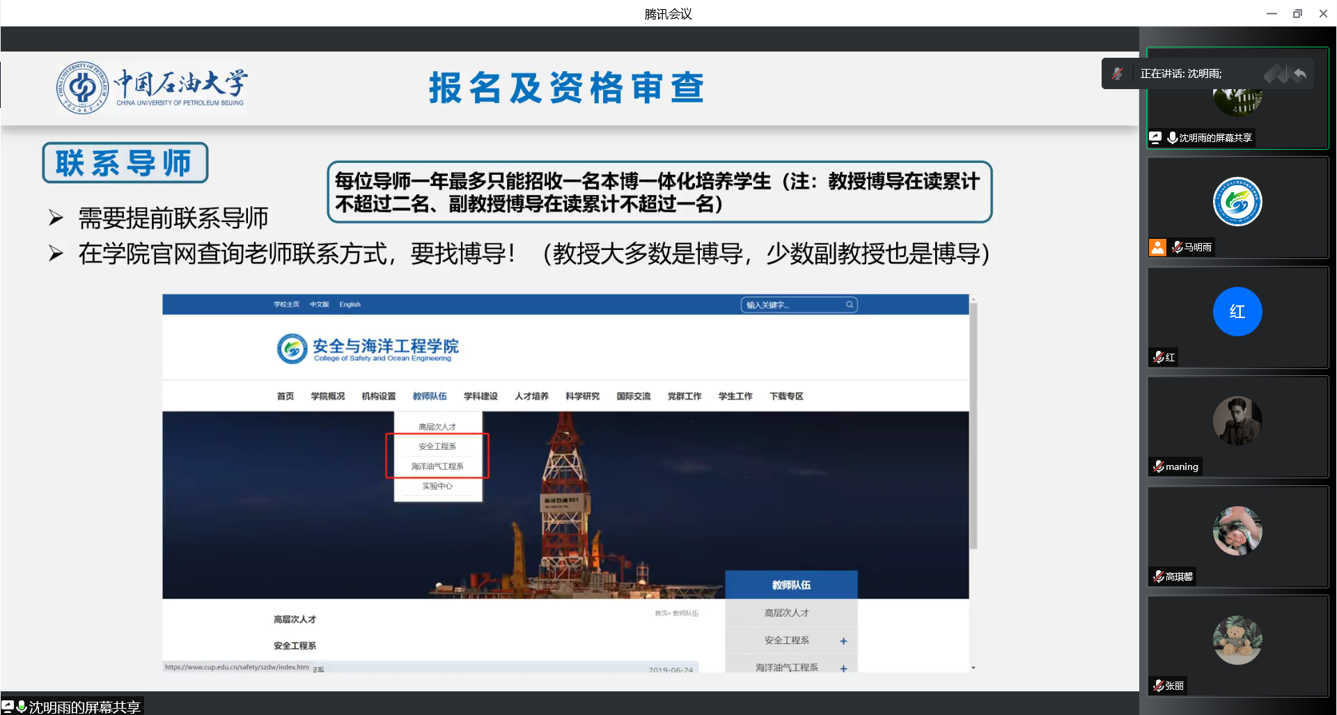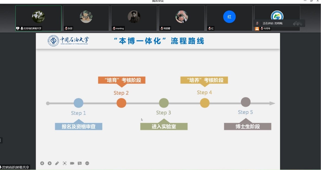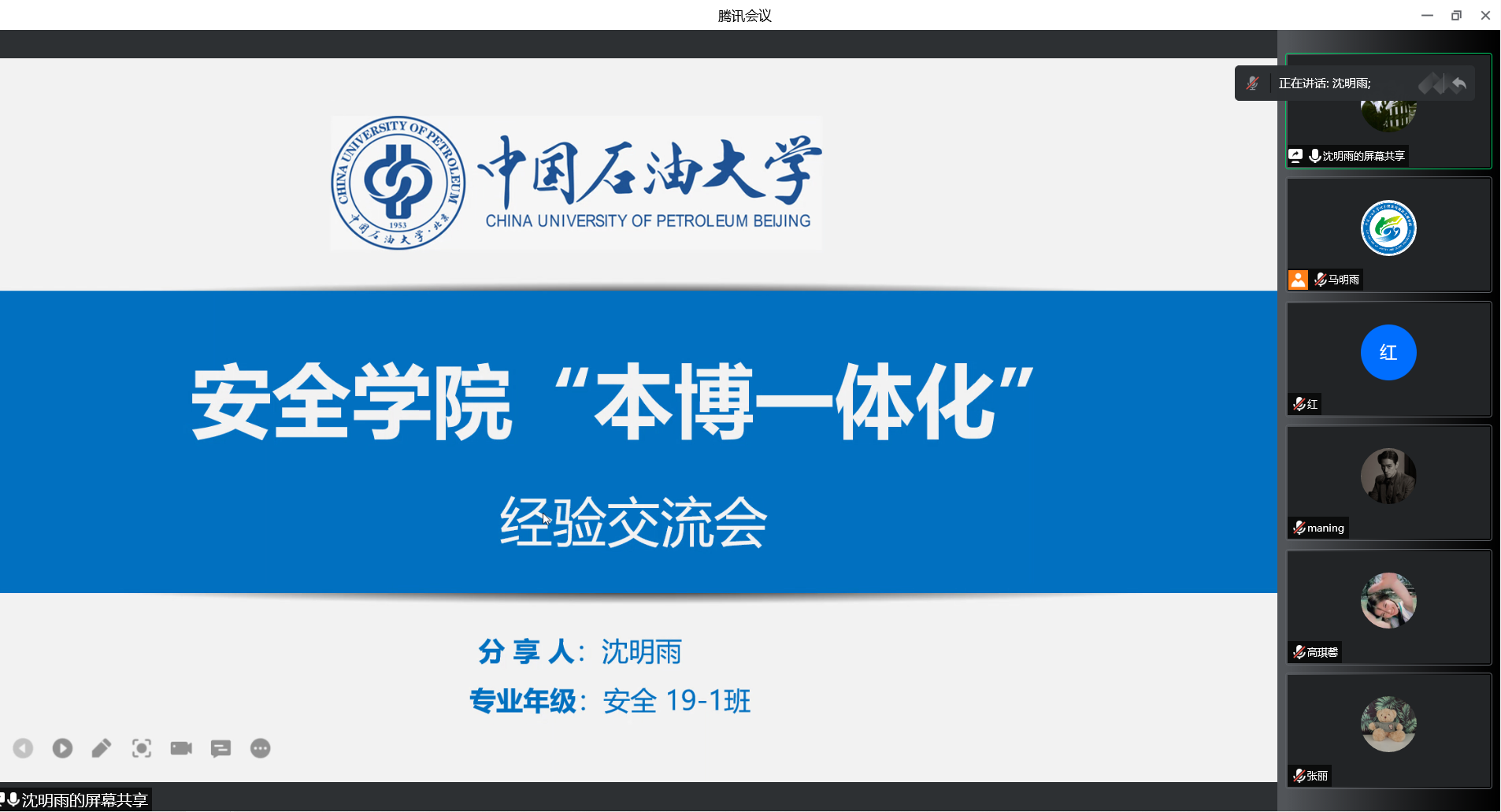 安全专业19级沈明雨向大家分享作为本博一体化培育学生的经历和心得。沈明雨以“本博一体化”流程路线的各个阶段向大家介绍了具体内容和相关注意事宜,同时分享了加入组会后学习和生活的一些具体情况。最后,他鼓励同学们勤奋学习,为实现自己更好发展而不断努力!
