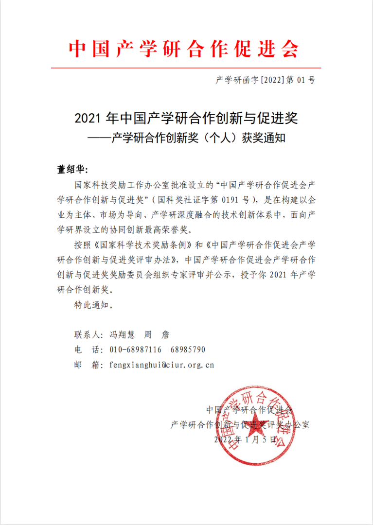 中国产学研合作创新与促进奖是由科技部和国家科技奖励办公室批准设立,是在构建以企业为主体、以市场为导向的产学研深度融合中,面向产学研界设立的协同创新最高荣誉奖。该奖项旨在表彰产学研合作创新工作中做出突出贡献的单位和个人,对提升全民科技创新意识,提升产学研合作的水平和质量,具有重要的激励作用。