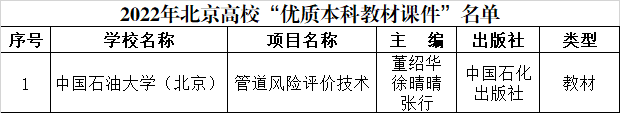 近日,北京市教育委员会公布2022年北京高校“优质本科课程”“优质本科教材课件”“优秀教学管理人员”“优秀本科实验教学指导教师”“本科教学改革创新项目”等奖项和项目的评审结果。我院海洋油气工程系杨进教授获评北京高校“优秀教学管理人员”,安全工程系董绍华教授、徐晴晴老师主编的《管道风险评价技术》获评北京高校“优质本科教材课件”。
