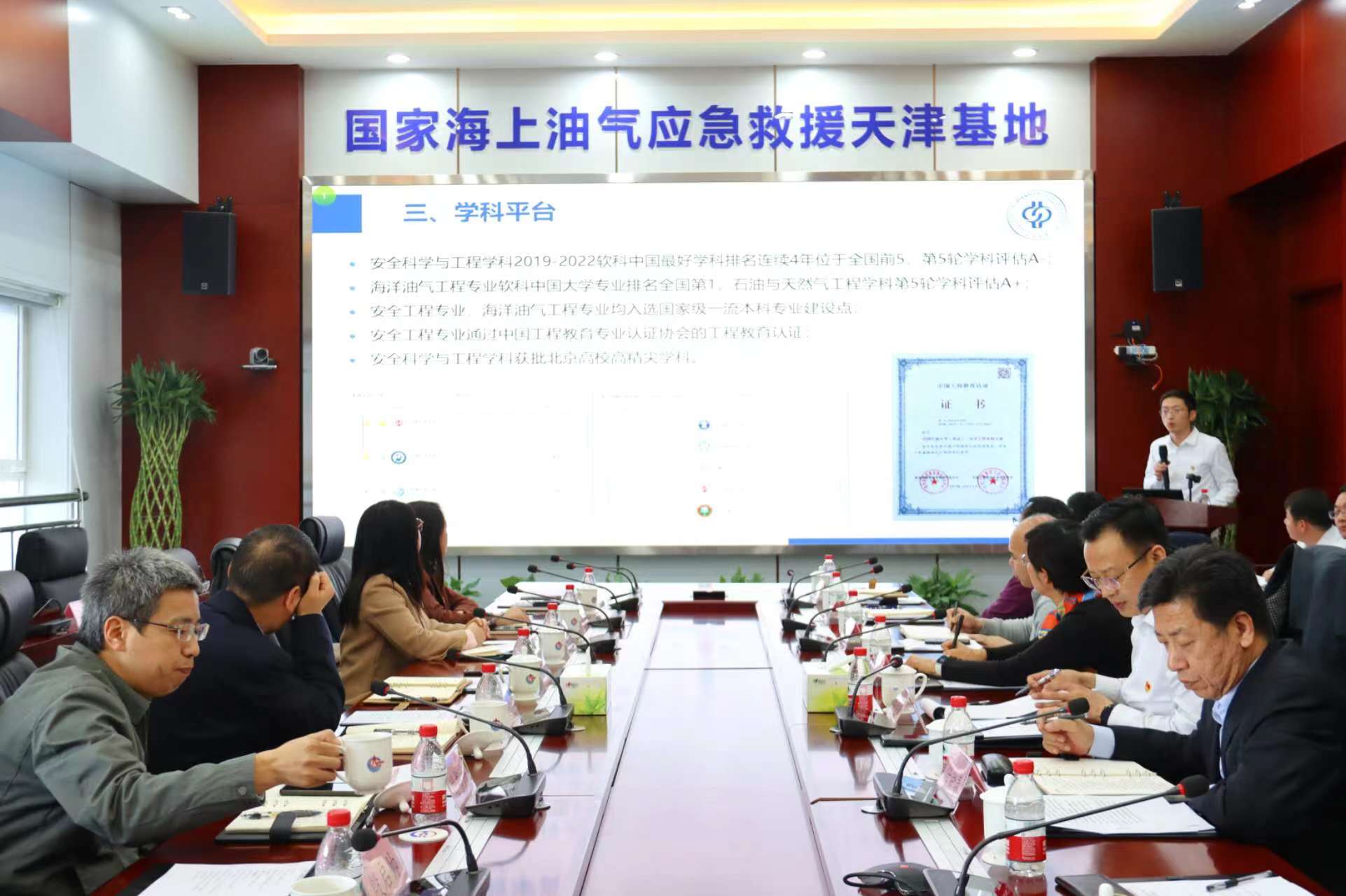 会上,安全与海洋工程学院副院长郑文培介绍了学院学科平台发展概况及科研成果与人才培养成效,工程技术公司科创与数字化部经理马认琦介绍了公司数字化发展及国家海上油气应急救援天津基地建设现状。双方就工程实践现场问题、校企双向人才培育输送、研究生“双导师”人才培养模式及实习实践基地共建进行了深入的交流和讨论。