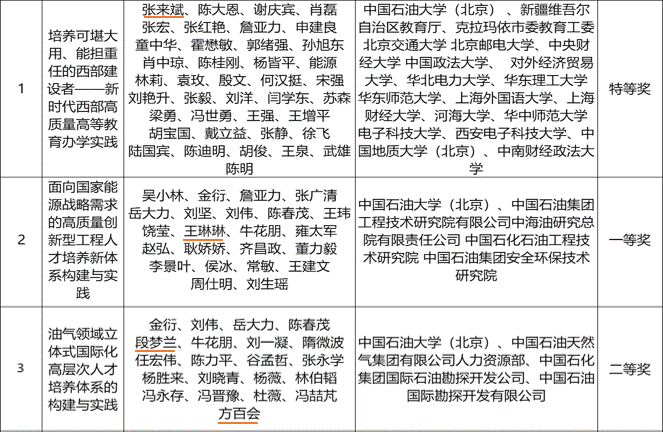 张来斌院士主持完成的“培养可堪大用、能担重任的西部建设者——新时代西部高质量高等教育办学实践 ”获特等奖,王琳琳教授参与完成的“面向国家能源战略需求的高质量创新型工程人才培养新体系构建与实践”获一等奖,段梦兰教授和方百会老师参与完成的“油气领域立体式国际化高层次人才培养体系的构建与实践”获二等奖。