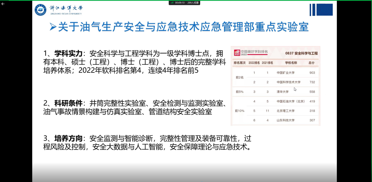 李晓丹通过宣讲PPT,分享了考研复试的准备事宜及面试注意事项等,对学校和学院的整体情况进行了介绍,并从学科实力、科研条件、培养方向、师资队伍以及科研成果等方面,着重介绍了油气生产安全与应急技术应急管理部重点实验室。