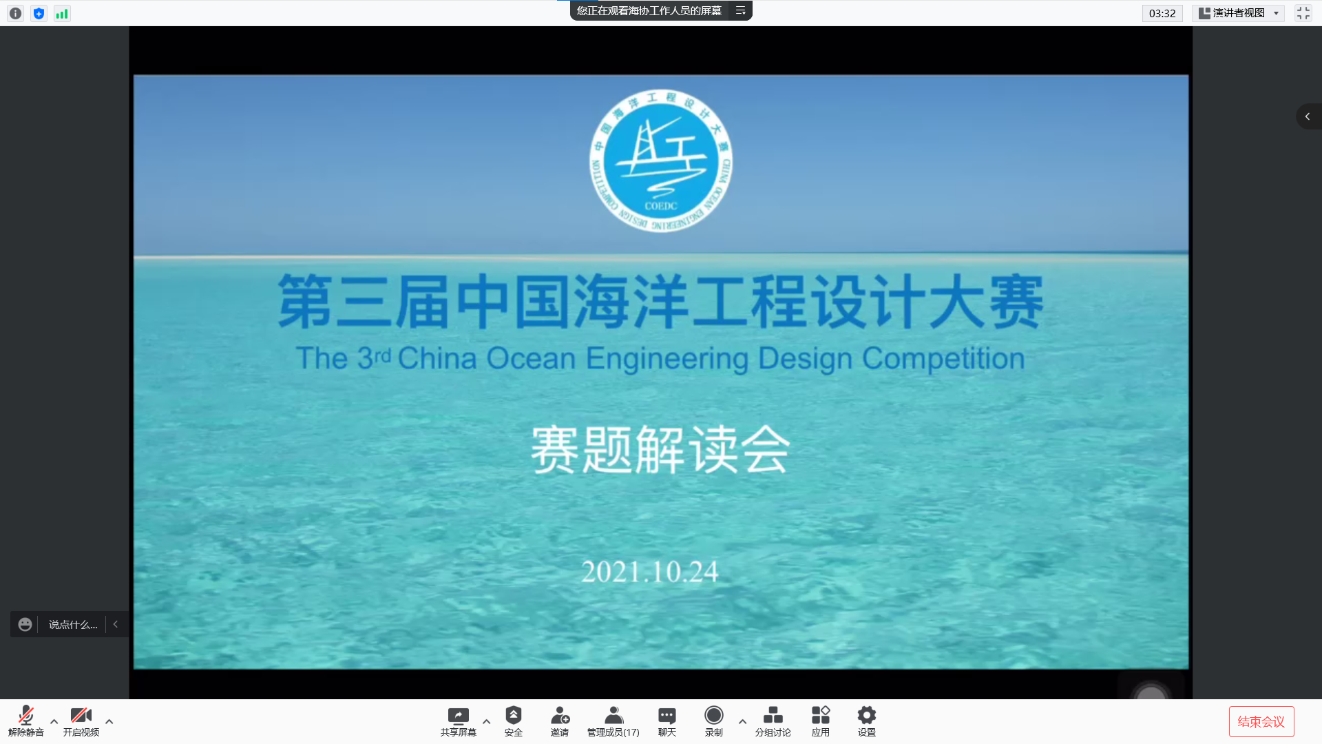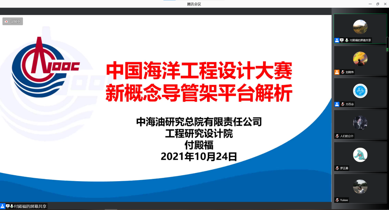 10月24日,由中国海洋工程设计大赛组委会主办的第三届中国海洋工程设计大赛赛题解读会以线上会议的形式顺利召开,本次赛题解读会邀请到中海油研究总院工程设计院副院长付殿福担任主讲嘉宾,会议由大赛组委会工作人员、中石大安全学院团委书记方百会主持,各高校参赛选手和指导老师共计400余人参加了此次会议。