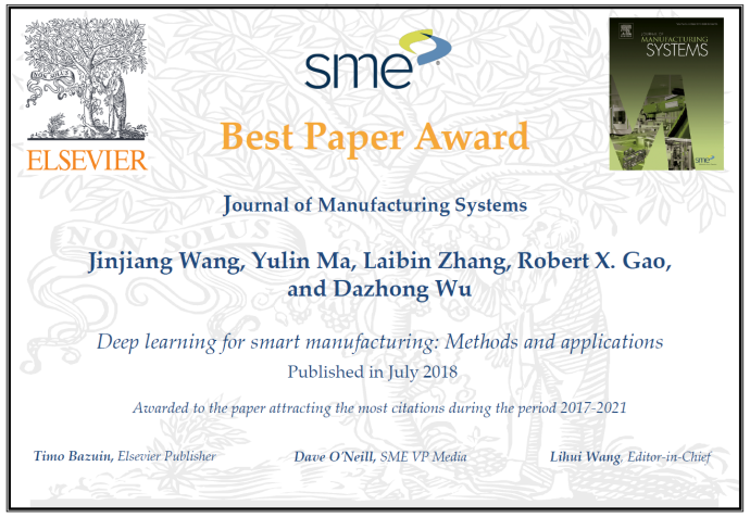 据悉,Journal of Manufacturing Systems期刊为国际制造工程学会(SocietyofManufacturingEngineering)会刊,创刊于1999年,是国际制造工程领域具有重要影响力的权威期刊,影响因子为8.633. 该奖励每年评选一次,此次为该奖项设立以来的国内学者首次获奖。