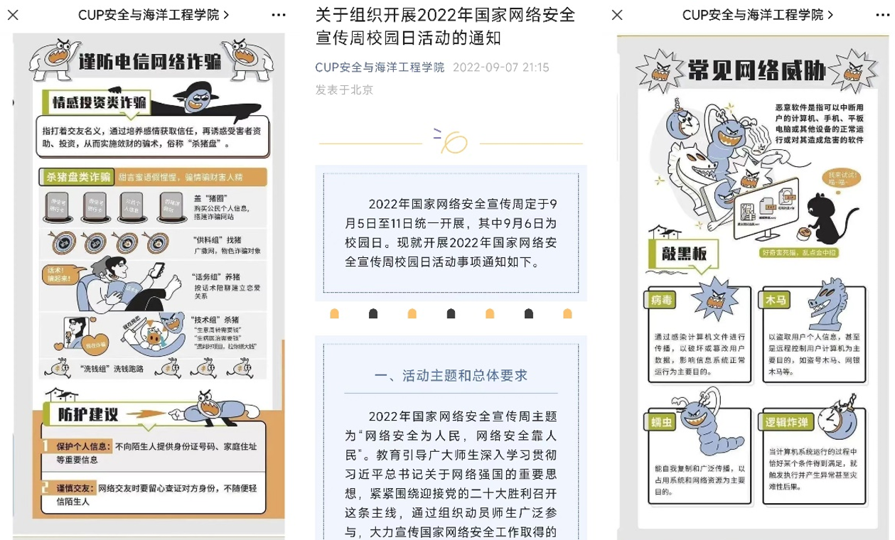 安全与海洋工程学院将网络安全宣传周及校园日有关活动纳入秋季学期安全教育,把师生反诈教育列为常态化重点工作,充分调动学生积极性、主动性和创造性,助力提升广大师生网络安全意识和防护技能,持续增强老师和同学们的网络安全意识和能力。