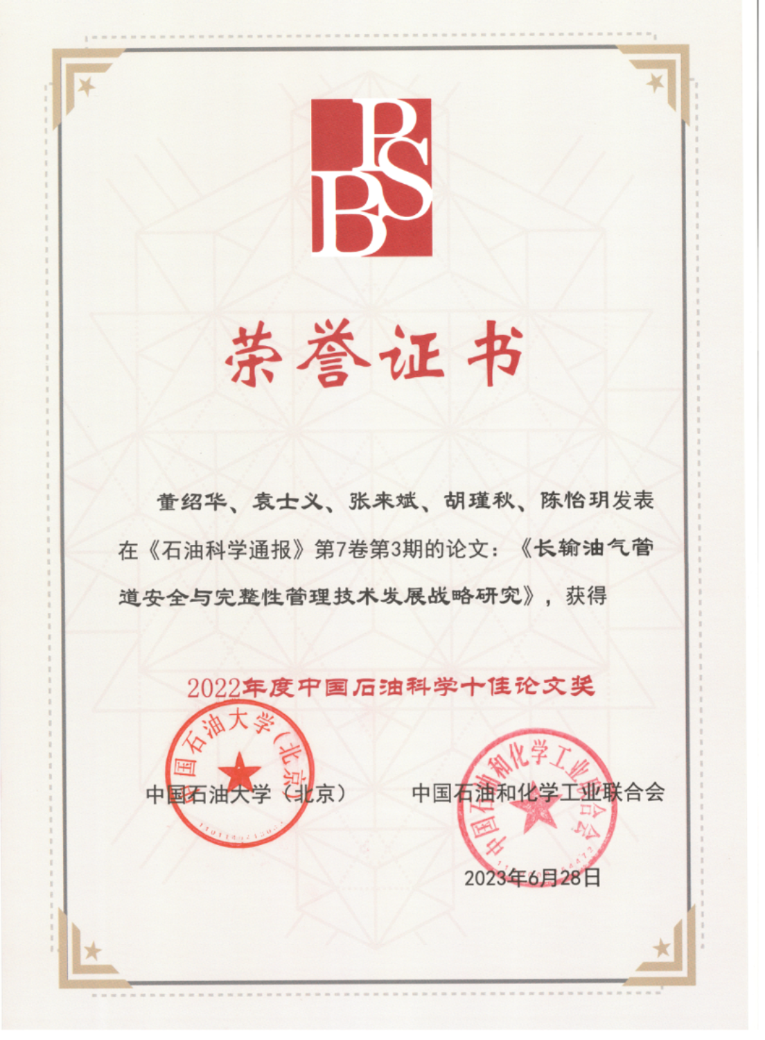 6月28日,2022年度中国石油科学十佳论文发布会在在中国天天色天天(北京)举行,安全工程系董绍华教授、张来斌院士、胡瑾秋教授、陈怡玥博士等2022年发表于《石油科学通报》第7卷第3期的论文“长输油气管道安全与完整性管理技术发展战略研究”获得2022年度中国石油科学十佳论文奖。