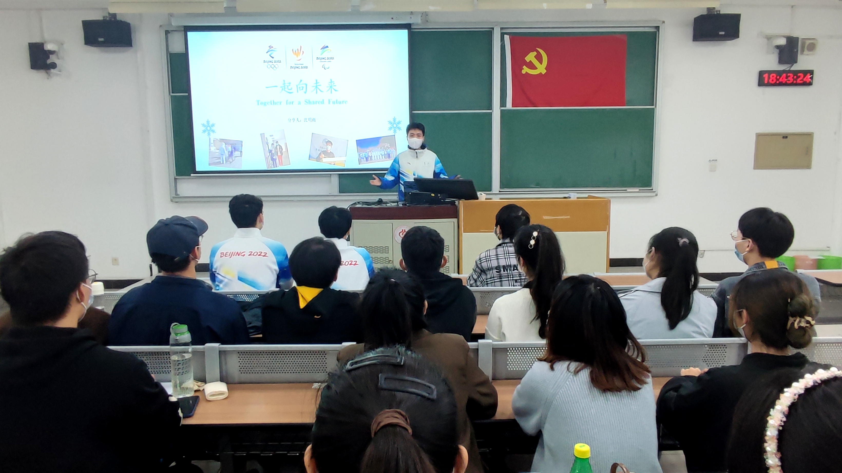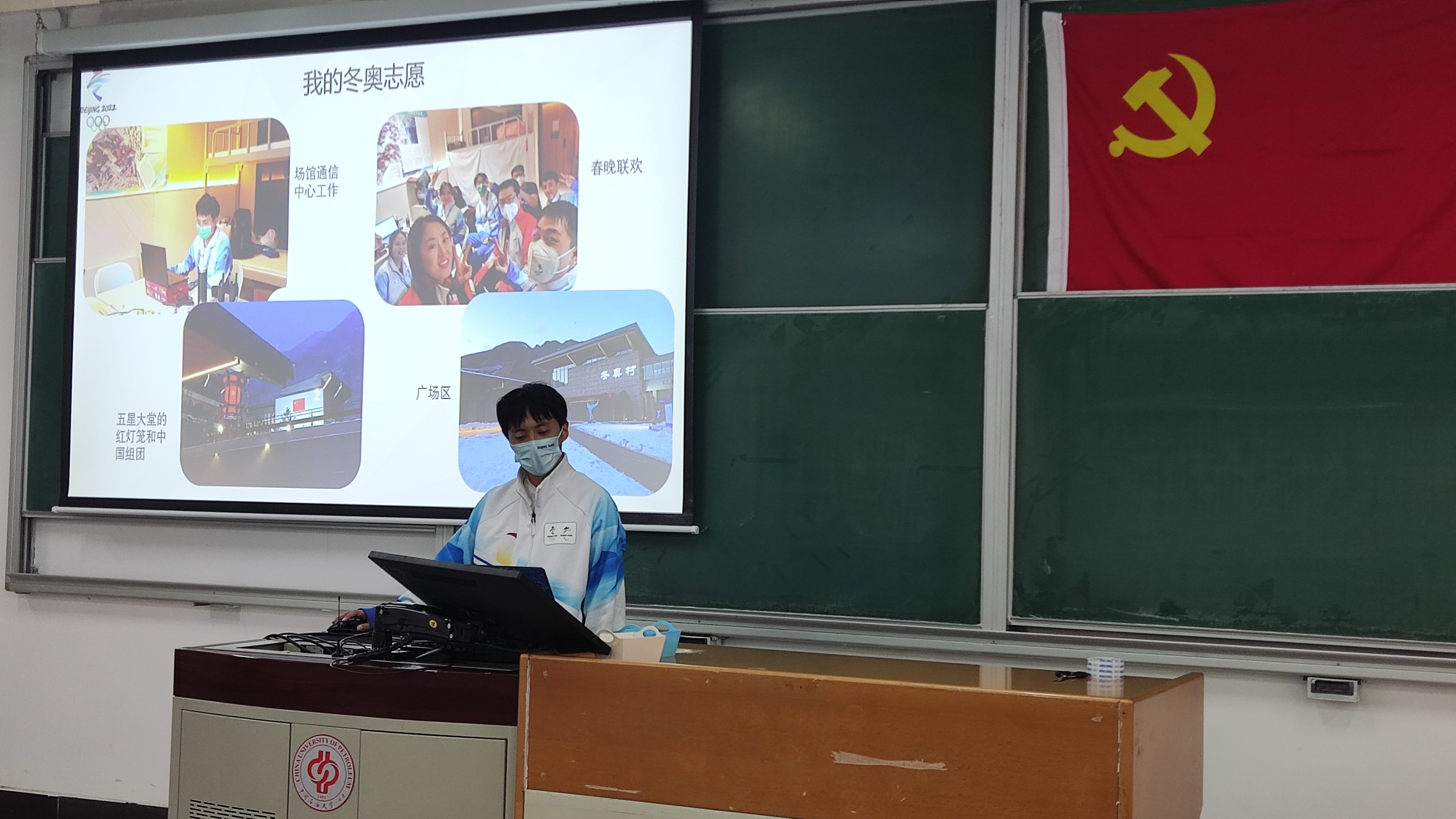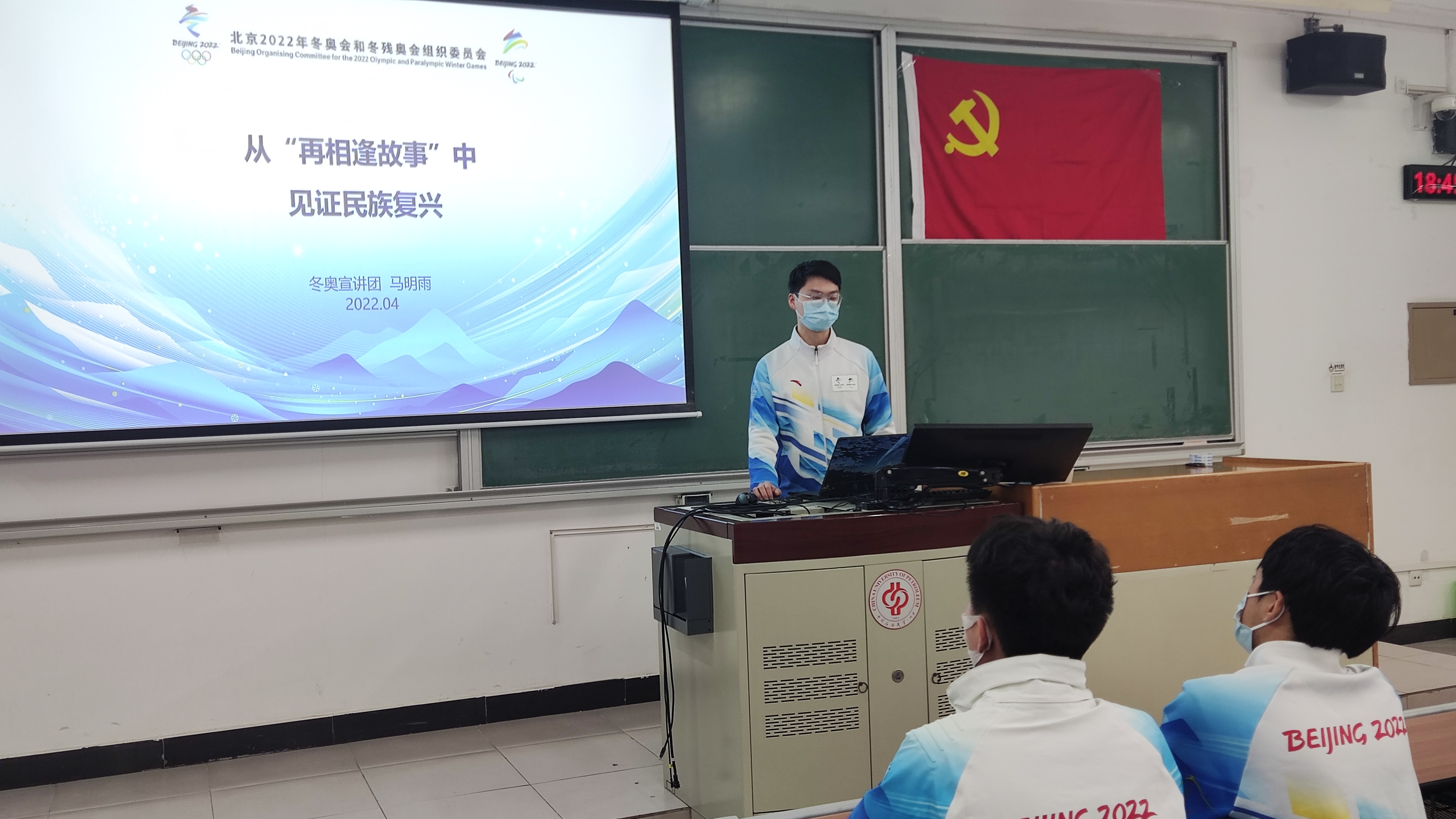本安全第一党支部书记马明雨介绍党日活动开展的背景。于龙同志以一名冬奥会志愿者的身份从个人参与志愿者动机、冬奥会志愿服务经历以及个人感受来讲述在冬奥会志愿期间的所感所想;沈明雨同志从志愿者历程和工作内容及志愿感受讲述了其在志愿者服务中的暖心瞬间、个人对于志愿者工作的所思所想,并呼吁全体党员应参与到志愿服务的大家庭之中;马明雨同志以“从再相逢故事中见证民族复兴”为主题,从其个人的特殊成长经历开始讲述,为同学们展示了在延庆冬奥村见证的国家在发展中逐步走向富强的真实缩影。