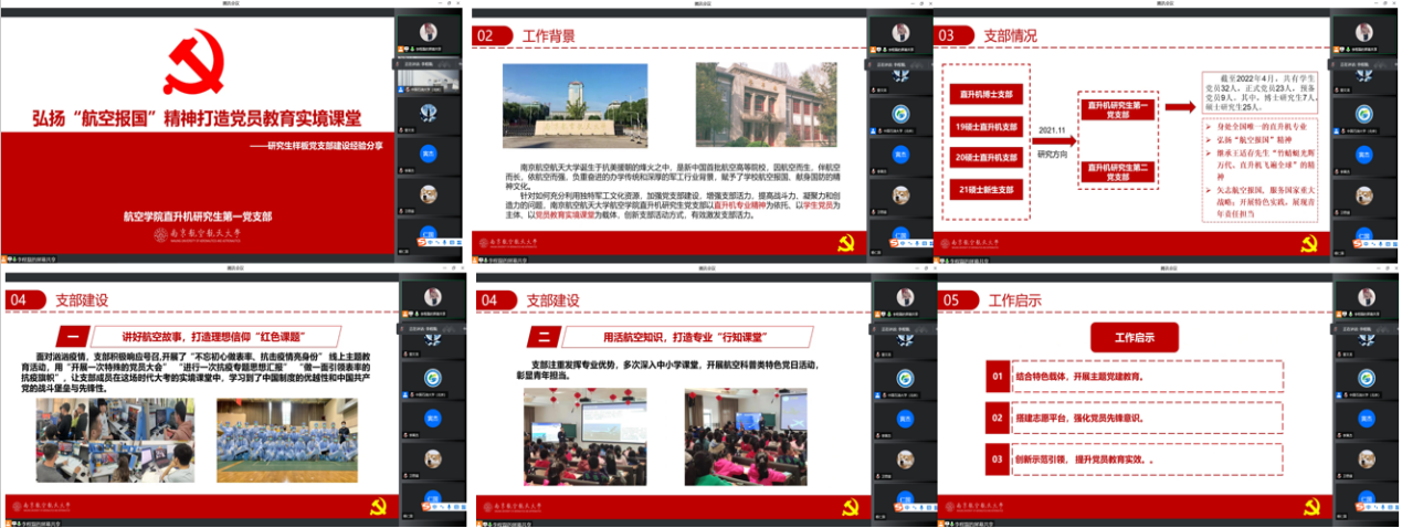 随后,直升机研究生第一党支部李程磊进行了“弘扬航空报国精神打造党员教育实境课堂”研究生样板党支部建设分享。