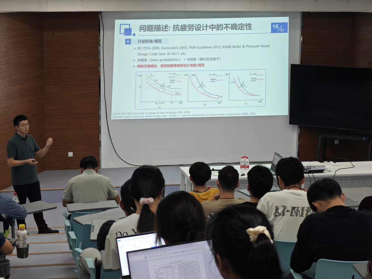 朱顺鹏表示,为推进我国重大装备自主研制进程,其关键结构寿命设计与可靠性评定迫切需要发展结构疲劳力学设计理论与性能评价方法。重大装备热端结构服役环境异常恶劣,同时,针对其构造异型、全尺寸试验成本高、测试方法难以标准化以及多场-极端服役环境试验无法开展等因素致使相关变形、疲劳寿命等数据严重不足及强分散现状。朱教授结合多项工程应用案例,讲述了重大装备结构疲劳可靠性理论方法以及前沿进展。报告结束后,朱顺鹏与在场师生就等比例缩小试验、微裂纹监测与产生、结构与材料对应力集中影响等问题进行了互动交流。