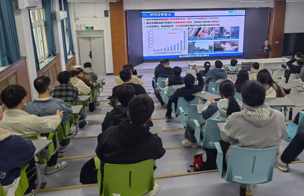 王志荣教授首先介绍了当前新能源储能和动力电池安全的典型事故,指出当前研究仍然存在致灾机理不清、安全预警定位准确性较低、热失控阻隔和灭火效果较差等问题。然后阐述了新能源储能和动力电池致灾机理及其演化规律,介绍了电池材料本质安全设计方法,最后从电池热失控预警定位、热失控阻隔和灭火等方面阐述了相关研究现状和取得的进展。报告结束后,王志荣教授与在场师生就锂电池关键部件材料研制、动力电池安全防护、锂电池热失控行为预警监测等技术问题进行了互动交流。