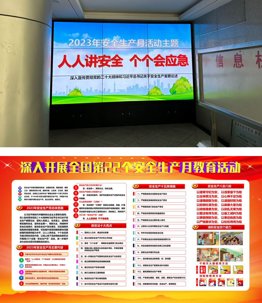 安全生产月期间,学院充分利用电子显示设备等,在安全科技楼大厅循环播放校园实验室事故案例视频、安全生产月宣传标语海报等,通过这种形式让师生重新认识当前学校安全形势、重视实验室安全,切实提高实验室安全管理水平。