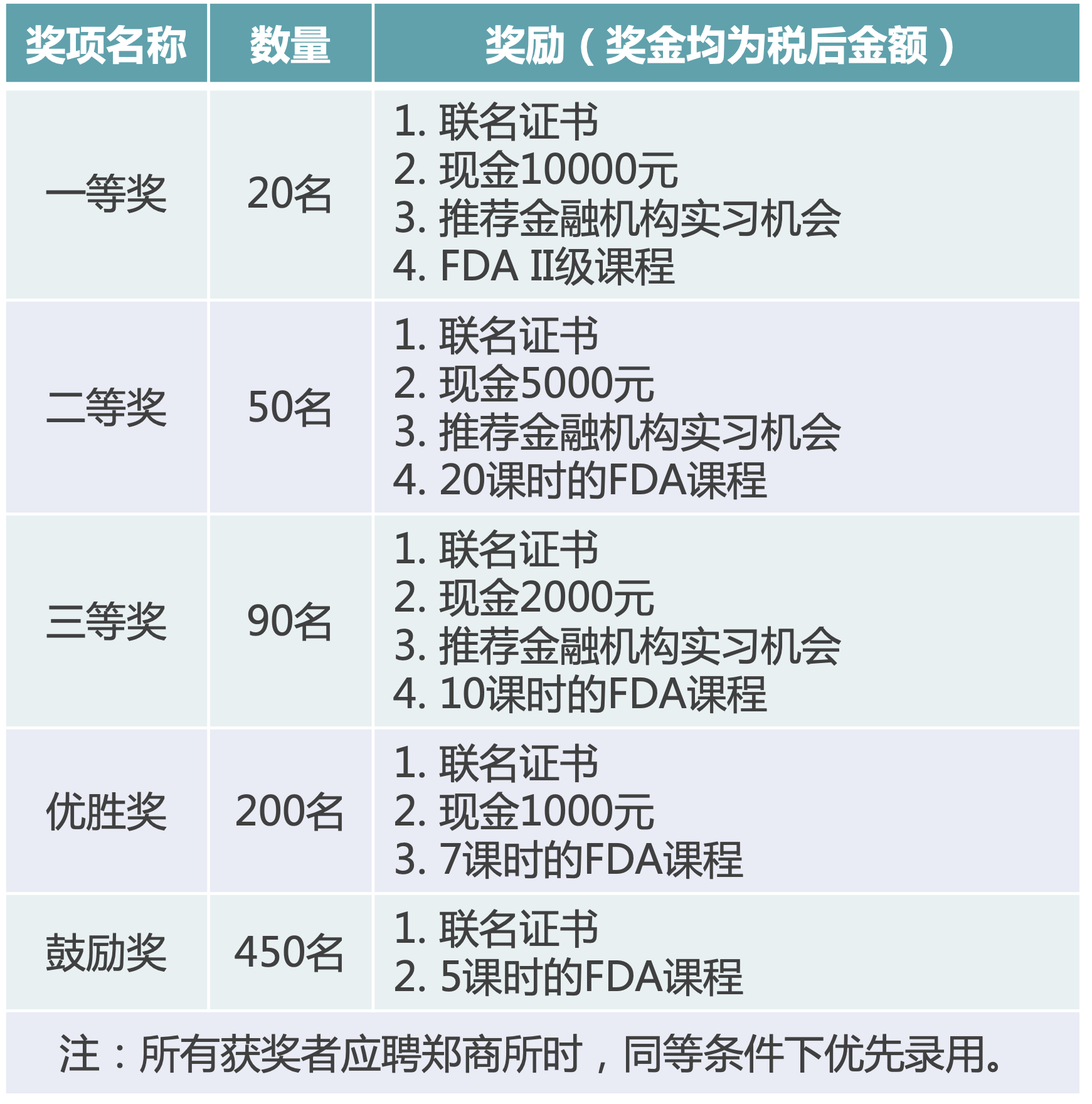 本届大赛设立5个等级奖项,具体分为一等奖、二等奖、三等奖、优胜奖和鼓励奖。其中,一等奖20名,二等奖50名,三等奖90名,优胜奖200名,鼓励奖450名,共计810名(具体见下表)。