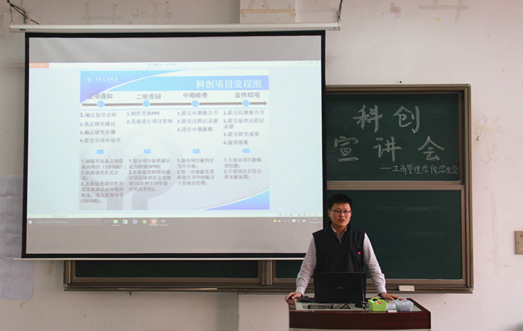 2016年4月28日星期四,工商管理学院学生会学习部携手科创部,为大一新生献上了一堂干货满满的科创宣讲会。宣讲会下午15:30于我校地质楼一号阶梯教室准时开始,王晨阳、赵起凤、连西静三位优秀的学长学姐依次分享了各自科创的成功经验与心得体会。 王晨阳学长从科创基本情况、选题原则、计划安排等方面进行了详尽系统的阐述,使大一新生对科创的程序有了全面的了解;起凤学姐则概要地分析了科创是什么、为什么、怎么做,让我们对科创的意义有了更深的领悟;连西静学长更是对学弟学妹们提出了“求知若饥、虚心若愚”的殷切期望,认为我们应当首先端正自身的态度,明确科创的真正意义在于求知和实践。三位分享者都谈到在科创中要紧扣热点,进行有价值、可操作的选题,采用对比分析的多种调研方法,做到文本格式的严谨无误与内容的丰富精彩。 大会现场同学们提问热烈,展示了自己的理解思考,学长学姐也耐心给出了一针见血的回答,让与会者获益良多。祝愿商院同学在科创中增长学识、丰富历练,取得满意的成果。