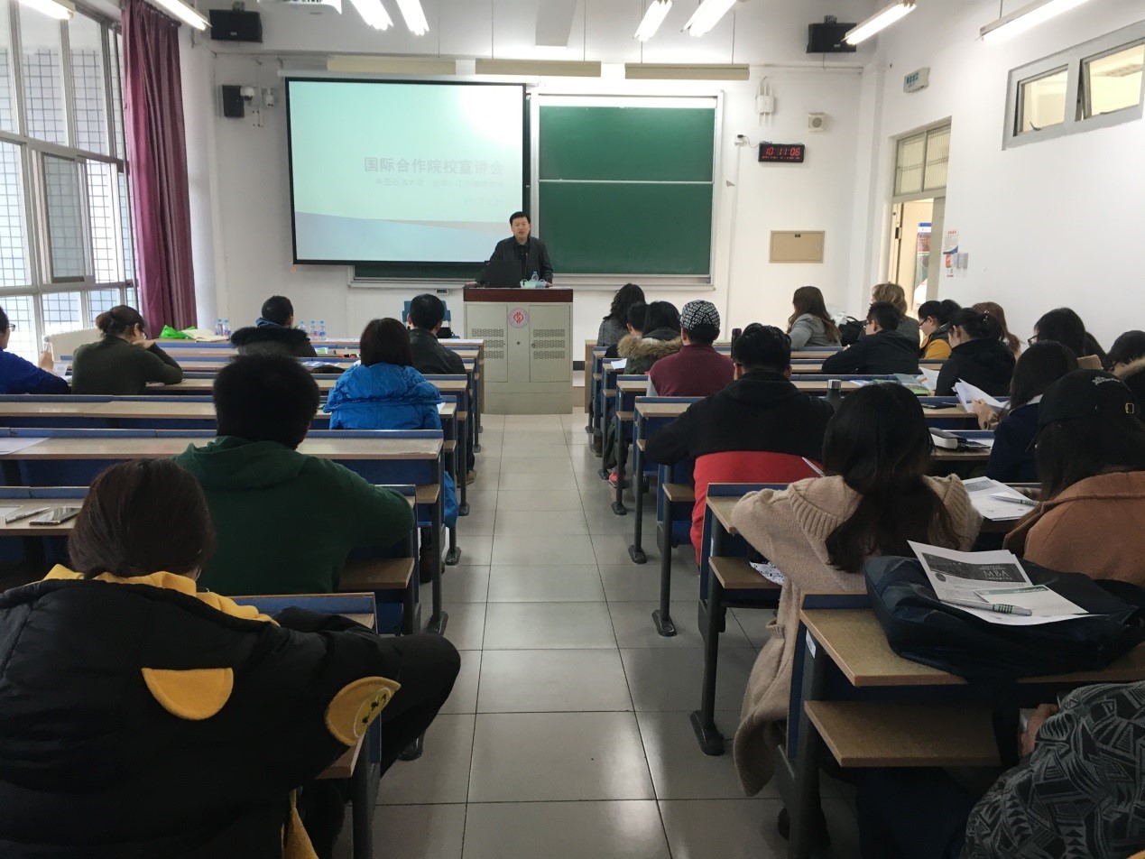 宣讲会首先由沈庆宁副院长向学生们做简短发言,陈述学生出国交流的好处,尤其是对以后申请名校研究生或找好工作都有益处;其次,强调了出国渠道和交流平台教学质量的重要性;最后动员大家多多关注留学机会,提早做好充分准备。