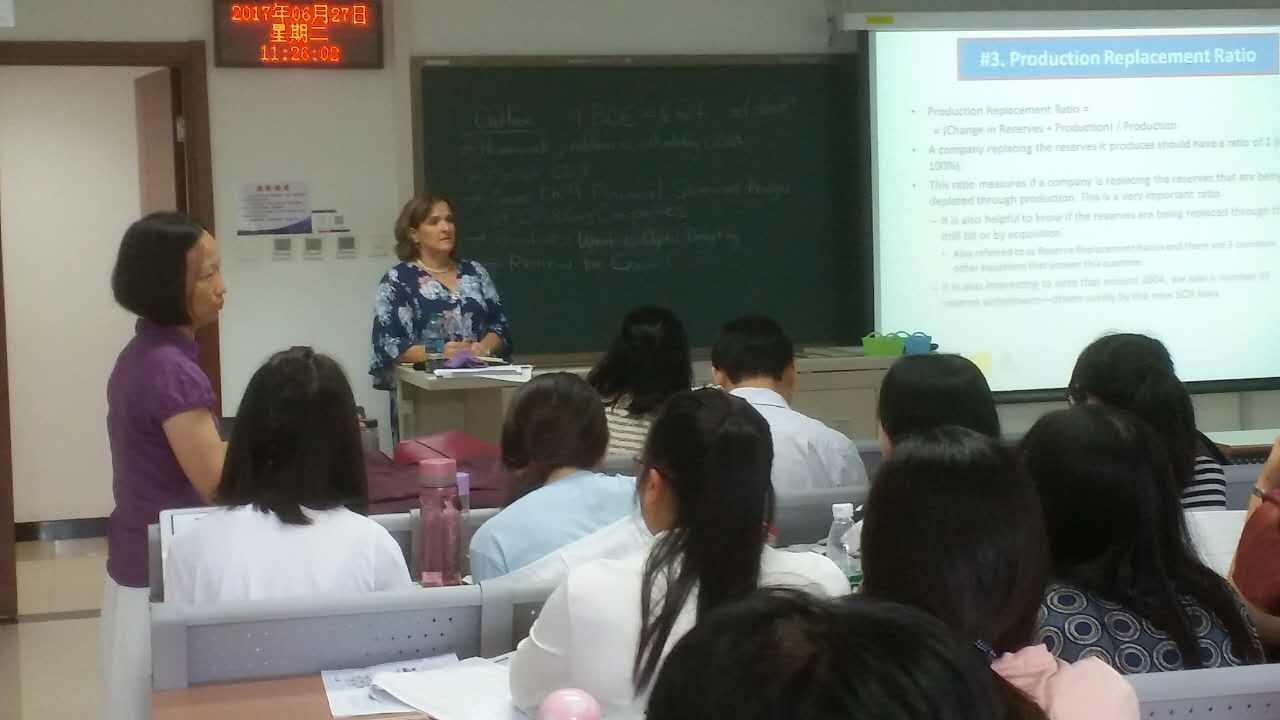 石大商学院经济与贸易系邀请俄克拉荷马州立大学的Betty Jo Simkins教授,Liying Xu教授共同为能源经济本科生讲授《能源金融》课程。