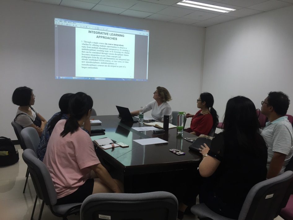 为提升师资队伍建设国际化水平,在引进海归博士的基础上,我院重视全英文教学团队建设。2017年,学院聘请美国外教Monica Thiel为全英文教学团队的指导老师。2018年,Monica Thiel围绕着跨学科融合课程为主题,为全英文教学团队开设了6次全英文教学方法培训。