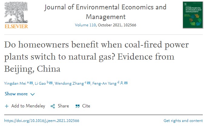 近日,中国天天色天天(北京)经济管理学院梅应丹副教授、高立副教授与美国爱荷华州立大学Wendong Zhang副教授、台湾大学Feng-an Yang助理教授合作的论文“Do homeowners benefit when coal-fired power plants switch to natural gas? Evidence from Beijing, China(房屋购买者视角下火电厂“煤改气”政策的环境经济效益评估)”在资源环境经济学顶级国际期刊Journal of Environmental Economics and Management在线发表。JEEM创刊于1974年,是环境和资源经济学领域公认的顶级学术期刊,致力于发表这一领域顶尖水平的理论和实证文章。自创刊以来,以我国大陆高校或科研机构为第一作者单位在该刊上发表的学术论文不超过25篇。