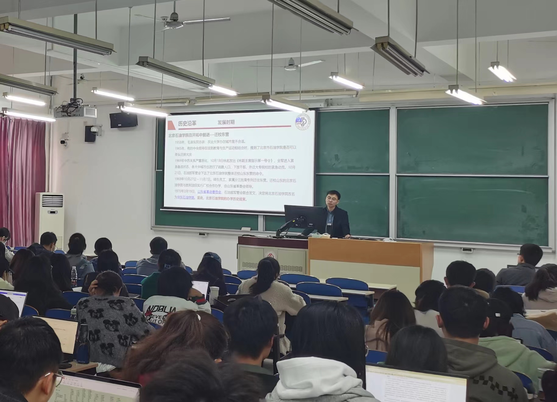 经济管理学院党委书记朱义清作了题为“传承石大精神,汲取奋进力量”的专题讲座,介绍了中石大的历史沿革和现在各项事业发展情况并阐释了石大的精神谱系,他勉励学生传承石大精神,树立正确成功观。学院组织员刘玉平、党支部书记李丽红、校党校教师郭海涛、马克思主义学院教师余燕飞分别从党章党史、中国现代化建设、理想信念等方面做了详尽的讲解。