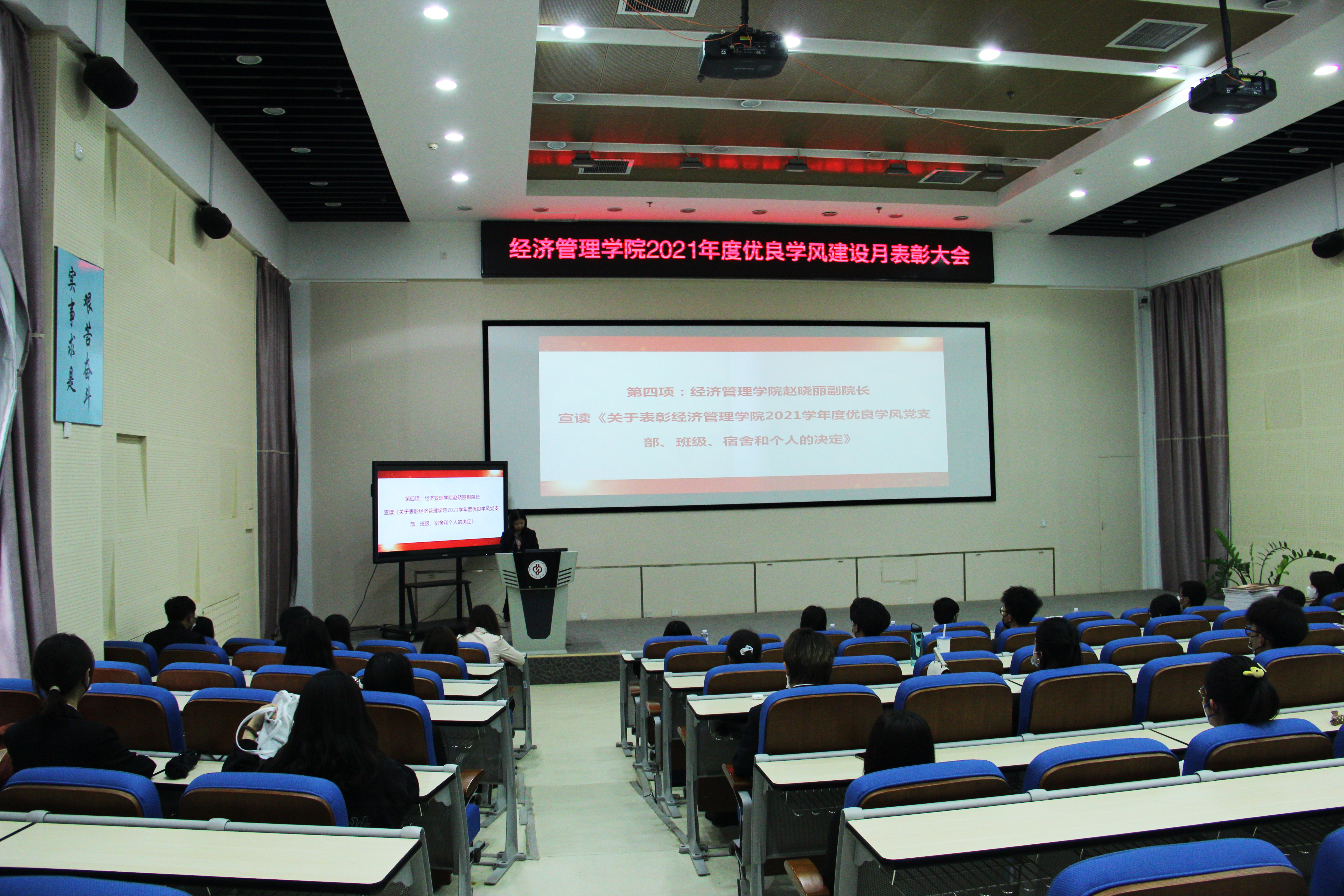 赵晓丽宣读了《关于表彰经济管理学院2021年度优良学风党支部、班级、宿舍和个人的决定》,并宣布了表彰名单,表扬了受表彰的集体和个人。