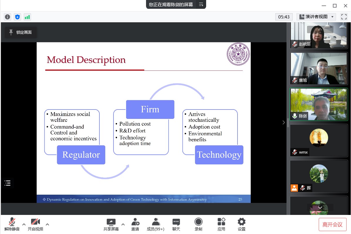4月1日下午,经济管理学院在线举办“春华论坛”第九期学术报告会,清华大学陈剑教授应邀进行了题为“信息不对称环境下绿色技术创新与采纳的动态管制策略研究”的学术报告。报告会由赵晓丽副院长主持,九十余名师生在线参与会议。