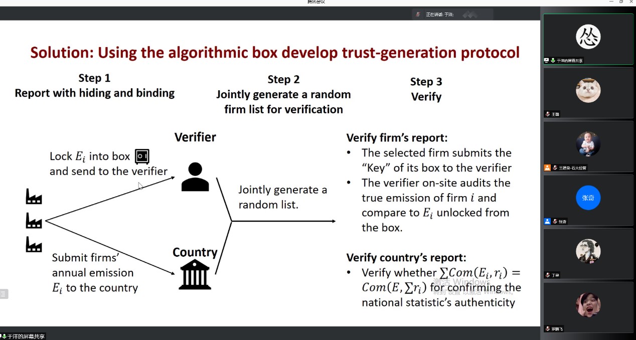 清华大学交叉信息研究院的于洋就“能源系统的数据质量与价值”这一主题进行了演讲汇报。于教授在报告中分享了他们团队将密码学应用到碳核查、碳管理上的相关成果,通过构建的密码系统将碳核查者和国家之间的互信问题转化为数学上获得真正随机数的问题从而解决碳核查的能源数据安全问题。