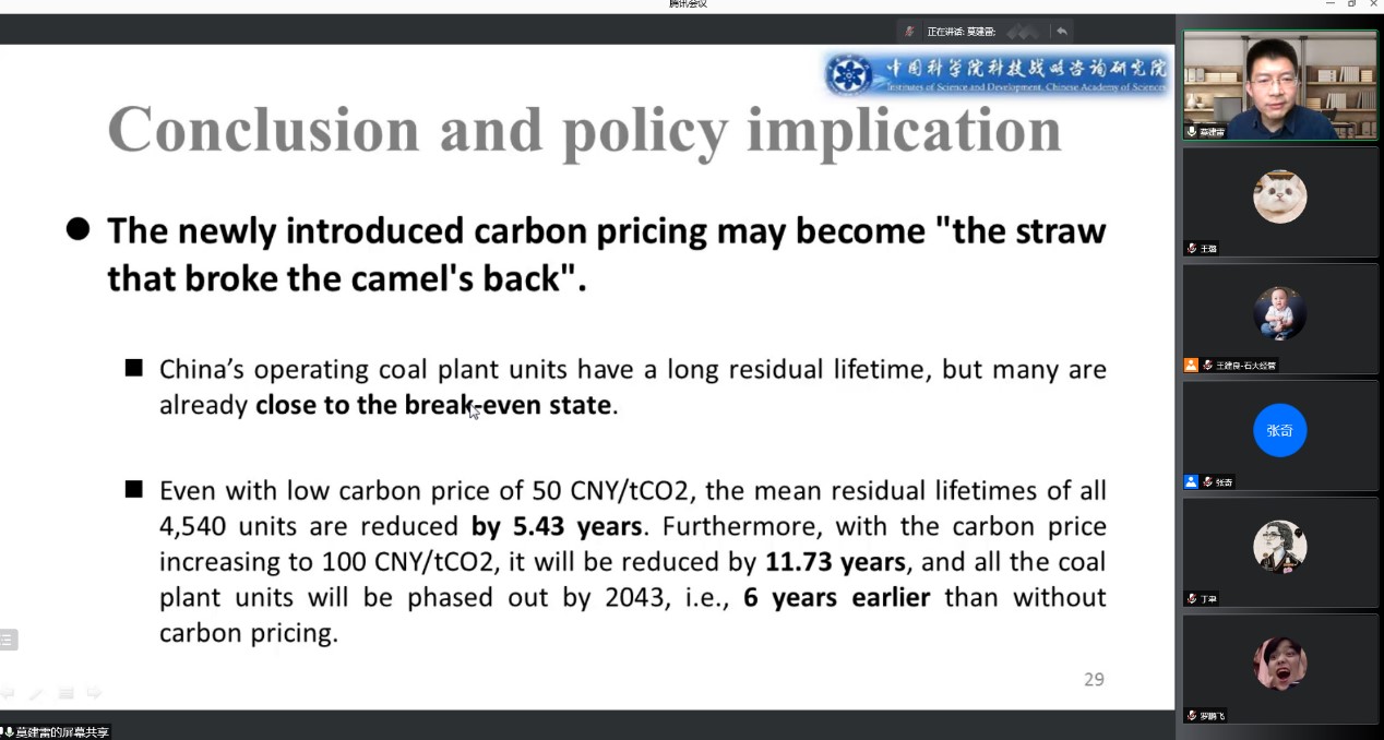 中国科学院科技战略咨询研究院的莫建雷分享题为“全国碳定价与化石能源资产搁浅风险”的研究。该研究以多因素考虑石油资源搁浅风险,并给出了碳定价的引入对火电机组、煤电机组影响结果分析,以及全国29个省份之间的异质性分析。