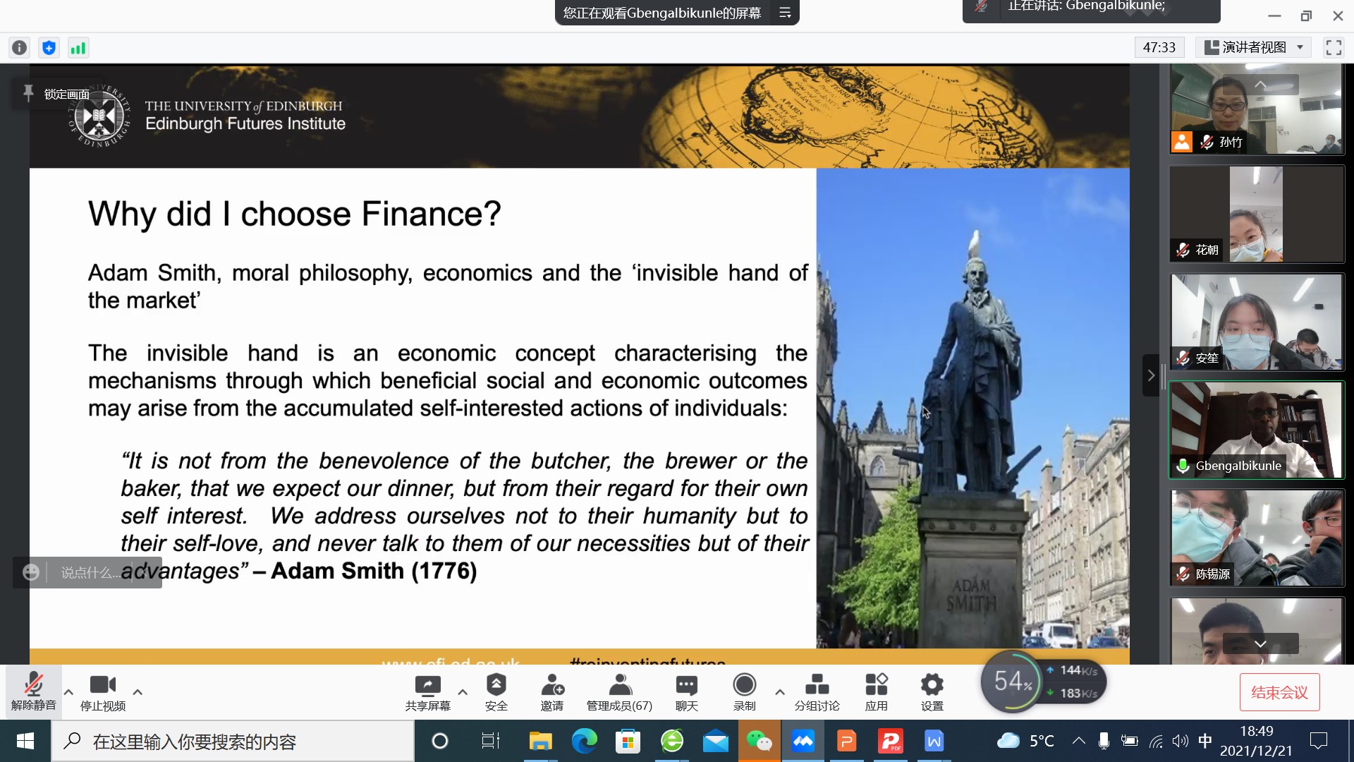 12月21日星期二晚上6:30-8:30,爱丁堡大学金融学教授Gbenga Ibikunle受金融系邀请,为我校21级经济学大类新生做了“Why did I choose Finance?”的线上讲座。同学们利用手机等设备通过腾讯会议方式参与了这次跨国线上讲座。讲座由孙竹教授主持,能源经济专业负责人冯连勇教授也参加了本次讲座。