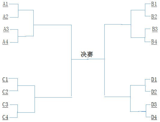 (4)本次比赛采用全程淘汰赛制,A、B、C、D四组分为四个赛区,首轮败者直接淘汰,胜者晋级八强。第二轮各分区赢者对阵决出四强,输者A区和C区对阵,B区和D区对阵,赢者决五六名,输者决七八名;赢者A区对C区,B区对D区,赢者决一二名,输者决三四名。