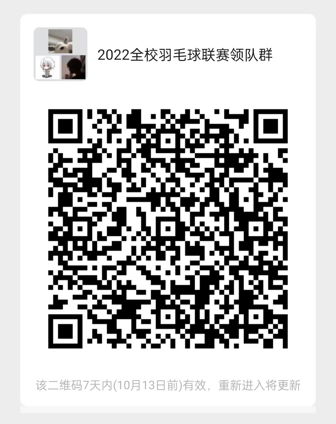 以院系为单位,每个学院可报领队1名、1-2支队伍,每支队伍10人。参赛选手请直接联系各学院学生会体育部,由各学院学生会体育部负责统计报名者信息(姓名、学号、专业班级等)。请各院领队负责人,扫码微信群号进入“2022全校羽毛球联赛”微信群。